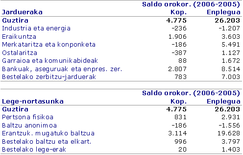 Azken urteetako dinamismoarekin jarraituz, Sozietate Mugatuak 3.114 establezimenduko saldo positibo osoa eta 19.628 lanpostuko gehikuntza garbia eman zuen 2006. urtean. Bada, urte horretan 239.659 lanpostu lortu ziren, guztien %27,2. Bestalde, sozietate anonimoetako establezimenduen kopurua aurten 186tan murriztu dira. Lanpostuen saldo garbia, berriz, 1.556 lanpostutan murriztu da.