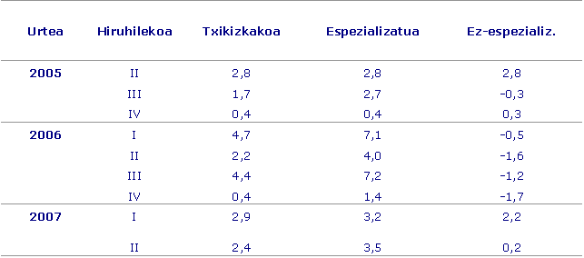 Txikizkako merkataritza espezializatuan, urte arteko hazkundeko tasarik handiena bestelako kontsumo ondasunen (kirolak, jolasak, optikak eta liburu-dendak, besteak beste) sektoreari dagokio. %12,4ko hazkunde nominala izan du; termino errealetan, %10,1ekoa. Pertsonen hornikuntzako ondasunek ere hazkunde nabarmena izan dute; horien hazkundea %3,9koa izan da termino nominaletan; tasa hori, termino errealetan, %3,7koa da (positiboa hau ere). Etxeko hornikuntzarako produktuen salmentak %0,8 gehitu dira euro arruntetan; termino errealetan, aldiz, %1,4ko beherakada izan da. Bestalde, Elikadurak %1,4ko beherapen nominala izan du baina beherakada %-5,5ekoa izan da termino errealetan.