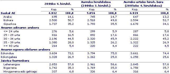 Jaiotzak amaren adinaren arabera banatuz gero, ikusiko dugu 30-34 urteko amen taldea dela nagusi oraindik ere, haien artean izan baitziren erditzeen % 44,5. Talde horren ondotik, hurrengo goragoko taldea kokatu zen, hau da, 35-39 urte artekoa (% 28); 25-29ko taldea beherago geratu zen, erditzeen % 16,5 ekarri baitzituen; eta 20-24ko taldeak % 5,6 besterik ez zuen hartu.