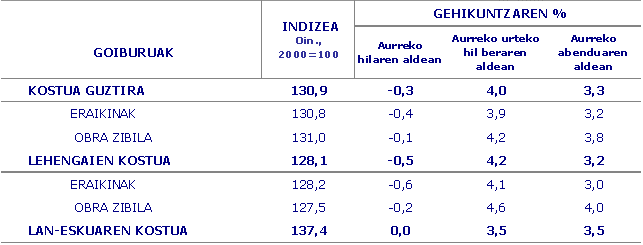 Urrian prezio hazkunderik handienak kontsumitutako honako lehengaiek izan zituzten: asfalto-produktuak (%2,0), petroliotik eratorritakoak (%1,9), erabilitako makineriaren osagarriak (%1,6) eta burdingintzako gaiak (%1,6), besteren artean. Aitzitik, hileko prezioetan murrizketak izan zituzten, besteak beste, beira (%-2,3), burdina eta altzairua (%-3,1), eta karea, igeltsua eta eskaiola (%-2,3) lehengaiek.