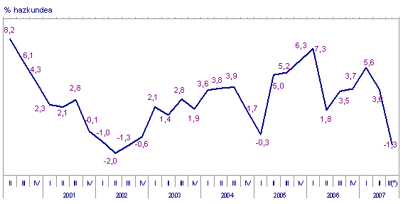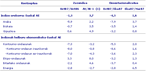 Sektoreka, eta industri sektore handien sailkapenetik, 2007ko uztaileko indizearen bilakaeran, 2006ko uztailaren aldean, hazkundea Ekipoko ondasunetan bakarrik daukagu (%3,3). Bitarteko ondasunetan (%-2,1) eta Energian (%-2,8) jaitsiera dugu eta baita Kontsumoko ondasunetan ere (%-7,3), kontsumo iraunkorraren ondasunetan (%-8,0) eta ez-iraunkorretan (%-7,0) izandako jaitsierengatik.