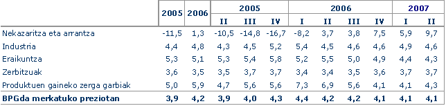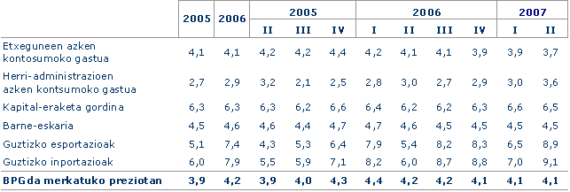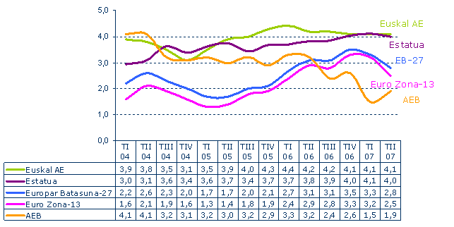 Eustatek landutako datuen arabera, Euskal AEko ekonomiak sortutako BPGak %4,1eko hazkunde erreala izan du 2007ko bigarren hiruhilekoan, 2006ko aldi beraren aldean. %4,1eko urte arteko tasa azken hiru hiruhilekoetan gertatu da eta euskal ekonomiaren jokaera ona oraindik nabarmenagoa da euro eremuko ekonomien hotzaldiaren testuinguruan.