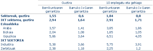Begiratzen badugu zer den berrikuntzako eta I+Gko gastua negozio zifraren gainean (barne berrikuntzako eta I+Gko intentsitate-ratioak), begi bistakoa da, baita ere, IKT sektorean baliabide gehiago joan zirela I+G+bra gainerako sektoreetan baino.