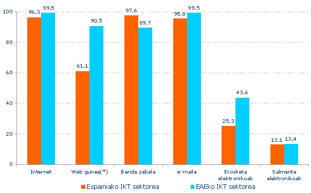 Espainiako datuen aldean, 10 enplegatu eta gehiagoko enpresetan, Euskal AEko IKT sektoreko tasak goragokoak dira ia adierazle guztietan.