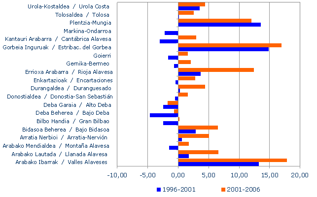 Udalerri jendetsuenen artean bada multzo bat, betidanik industriarekin erlazionatua, zeinak beherantz jarraitzen baitu. Hauexek dira: Bizkaian, Sestao (%-7,4), Portugalete (%-5,8), Basauri (%-4,2) eta Ermua (%-3,8); Gipuzkoan, Arrasate (%-5,7), Soraluze (%-4,4) eta Eibar (%-3,6); Araban Laudio(%-3).