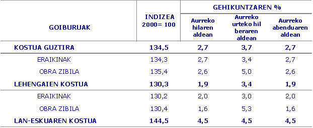 Urtarrilean prezio hazkunderik handienak kontsumitutako honako lehengaiek izan zituzten: karea, igeltsua eta eskaiola (%5,0), zementutik eratorriak (%4,4), zementu artifiziala (%2,8), zura eta kortxoa (%1,5), metalezko arozgintza (%1,4) eta egiturak eta galdaragintza (%1,4), besteren artean. Aitzitik, hileko prezioetan murrizketak izan dituzte: petroliotik eratorriak (%-0,9), olio eta koipeak (%-0,9), pintura eta bernizak (%-0,6) eta asfalto- produktuak (%-0,5).