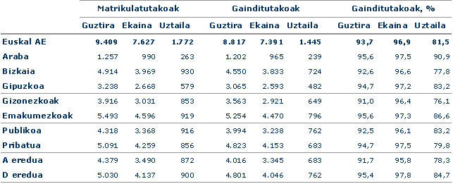 Ekaineko deialdian 7.627 ikasle matrikulatu ziren eta %97k gainditu zuten; uztailekoan 1.772 matrikula eta %82k gainditu. Bi deialdietan handiagoa da gainditutako nesken portzentajea, baina batez ere uztailekoan, non 10 puntuz gailentzen diren..