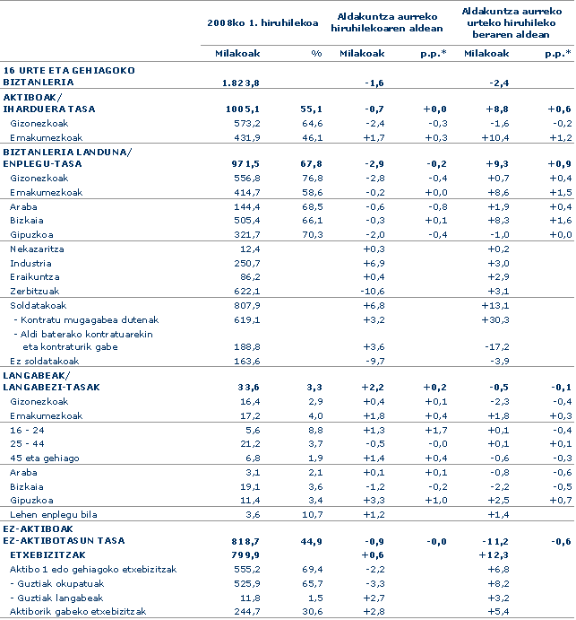 Euskal AEko lan-merkatuko 2008ko lehenengo hiruhilekoko datuen arabera, langabezia-tasa bi hamarretan igo da, aurreko hiruhilekoaren aldean; %3,3 delarik. Emakumeen langabeziari dagokionez, %4ra igo da (ehuneko 0,4 puntu gehiago), eta gizonezkoena hamarren bat gehitu da, %2,9 delarik. Gazteen langabezia-tasak altuena izaten segitzen du, %8,8, 1,7 puntuz igo delarik; horrenbestez, 16-24 urte bitarteko 5.600 gazte aktibo daude langabezian.