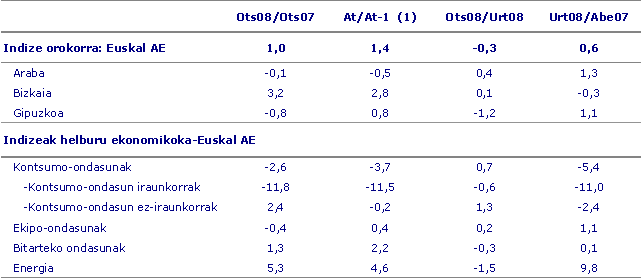 Lurraldeetako hil arteko hazkunde-tasei dagokienez (2008ko otsailekoak, 2008ko urtarrilaren aldean) bilakaera ezberdinak izan dira aipatu aldian: Araban %0,4 hazi da eta Bizkaian %0,1; Gipuzkoan behera egin du (%-1,2).
