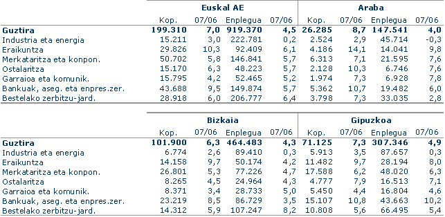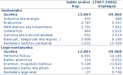 Jarduerari ekin dioten eta utzi dioten establezimenduen arteko saldo garbia 13.004 da, 2006an baino 8.229 gehiago. Enpleguaren sortze garbian 22.599 landun gehiago esan nahi du, establezimendu berriek enplegu-ekarpen handiagoa egin baitute itxi diren establezimenduen galeren aldean. Euren jarduerekin jarraitzen duten establezimenduen artean ere enplegua hazi egin da eta 16.769 lagun gehiago dituzte. Emaitza orokor gisa, jarduera ekonomikoak 39.368 lanpostu sortu ditu.