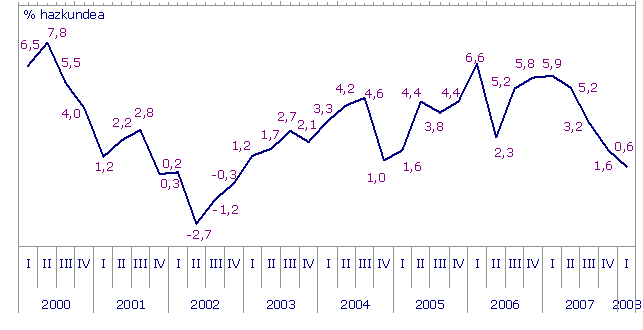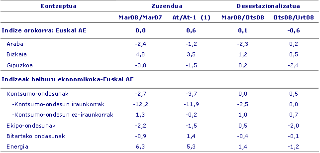 Sektoreka, eta industri sektore nagusien sailkapenean oinarriturik, 2008ko martxoko indizearen bilakaerak (2007ko martxoaren aldean) energia gehitzea ekarri du (%6,3). Alabaina, ekipamenduko ondasunak (%2,2), tarteko ondasunak (%0,9) eta kontsumo-ondasunak (%2,7) murriztu egin dira; azken hauen murrizpena, hain zuzen, kontsumo-ondasun iraunkorren (%-12,2) beherapenak eragin du, kontsumo-ondasun ez iraunkorrek %1,3 egin baitute gora.