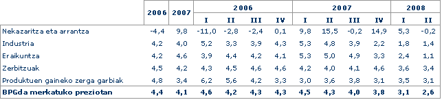 Zerbitzuen sektoreak BPGk baino tasa positiboagoa du, %3,4 hazi delarik; barruan, halere, ezberdinak izan dira jokaerak. Merkatuko zerbitzuak %2,7ko urte arteko hazkundea lortzera iritsi dira. Tasa hori BPGren hazkundearenaren antzekoa da. Ez-merkatuko zerbitzuek, berriz, hazkunde-erritmo handiari eutsi diote; urte artekoa aurreko hiruhilekoan bezalaxe hazi da, %6,5.