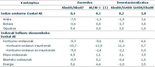 Sektoreka eta industri sektore handien sailkapenaren arabera, 2008ko abuztuko indizearen bilakaerak hazkundeak izan zituen Energian (%5,6) eta Ekipoko ondasunetan (%4,5), 2007ko abuztuaren aldean. Tarteko ondasunek %-0,9ko jaitsiera izan dute; Kontsumoko ondasunek %-9,3koa, Kontsumo iraunkorreko ondasunen (%-10,7), eta ez-iraunkorrekoen (%-9,0) jaitsierengatik.