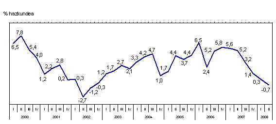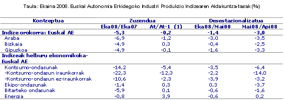 Sektoreen arabera, eta industri sektore nagusienak sailkatu ostean, 2008ko ekaineko indizearen bilakaera jaitsi egin da sektore guztietan, 2007ko ekainaren aldean: ekipamenduko ondasunak %1,4 jaitsi dira, tarteko ondasunak %5,9 jaitsi dira, energia %0,8 jaitsi da eta kontsumo-ondasunak %14,2; azken hauen beherakada, kontsumo-ondasun iraunkorrek (-%22,3) eta kontsumo-ondasun ez iraunkorrek (-%10,6) izandako beherapenen ondorioz eman da.