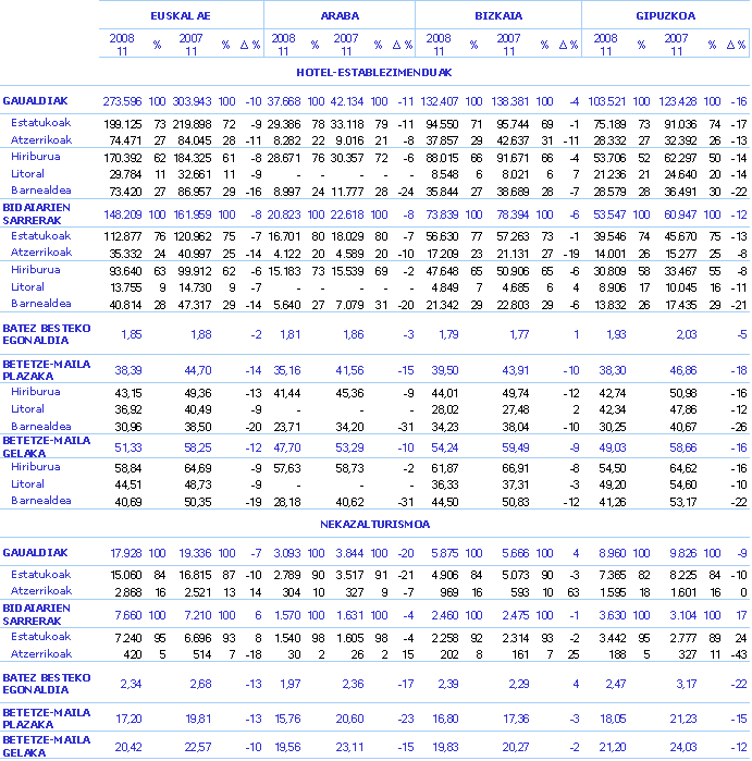 Plazen betetze-mailak %14ko jaitsiera jasan du, iazko azaroko %44,70etik aurtengo azaroko %38,39ra igaroz. Araban 2007ko azaroko %41,56ko plazen betetze-mailatik 2008ko azaroko %35,16ra igaro da. Bizkaian 2007ko azaroko %43,91tik joan den azaroko %39,50era jaitsi da. Gipuzkoan ere behera egin du, iazko %46,86tik 2008ko azaroko %38,30era igaroz. Gelen betetze-mailak ere behera egin du, bai Euskal AEko osorako (-%12) eta bai Araba (-%10), Bizkaia (-%9) eta Gipuzkoarako (-%16) ere.