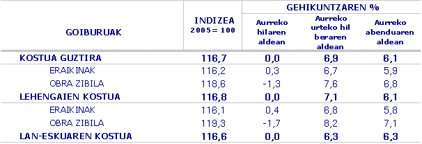 Sektorean kontsumitu diren lehengaien prezioari dagokionez, azken hamabi hilabeteetan inflazio-tasa handienak izan dituztenak ondokoak izan dira: Energia elektrikoa eta gasa (%27,2), Petrolioa fintzea (%12,8), Ura (%11,4) Metalurgia (%11,3) eta Ez-metalezko meak (%10,5). Bestalde, urteko arteko prezioetan (2008ko urria, 2007koaren aldean), igoera txikiagoak izan zituzten Zurgintzak (%1,9), Ez-metalezko industriak (%2,4) eta Makineriak (%2,6).