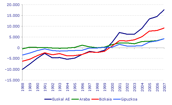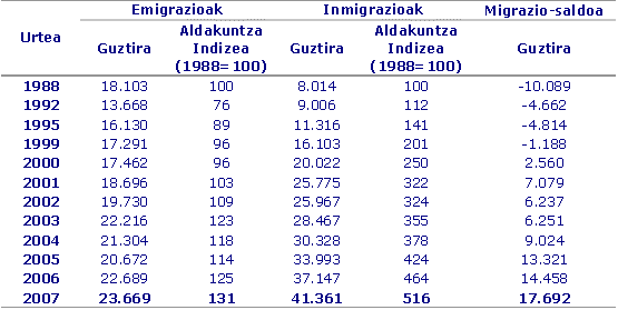 Kanpoko edo erkidegoz kanpoko mugikortasunari dagokionez, 2007. urtean AEko mila biztanletik 30,5 mugitu dira (‰37,5 Araban, ‰30,7 Bizkaian eta ‰27,1 Gipuzkoan); alabaina, mugikortasun hori gainerako autonomia-erkidegoetakoarekin erkatuta txikia da, azken hauetan mila biztanletik 51 mugitzen baitira.