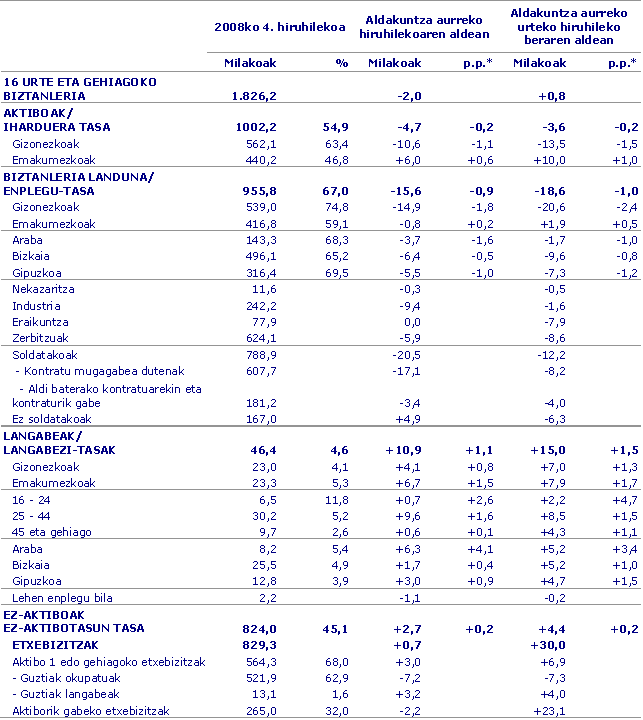 2008ko laugarren hiruhilekoko datuen arabera, langabeziatasa %4,6an da, aurreko hiruhilekoaren aldean ehuneko 1,1 puntu gehiago. Gizonen langabeziari dagokionez, %4,1era igo da (ehuneko 0,8 puntu gehiago), eta emakumeena 1,5 puntuz gehitu da, %5,3 delarik. Gazteen langabezia-tasak altuena izaten segitzen du, %11,8, 2,6 puntuz igo delarik; horrenbestez, 16-24 urte bitarteko 6.500 gazte aktibo daude langabezian.