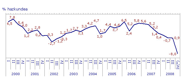 Sektoreen arabera, eta industriako sektore nagusien sailkapenari jarraiki, 2008ko indizearen bilakaerak ondoko aldakuntzak izan zituen, 2007ko azaroaren aldean: sektore guztiek jaitsiera jasan zuten, Energia sektorea izan ezik, % 2,1 hazi baitzen. Bitarteko ondasunek % 16,1 egin zuten behera, ekipamendukoak % 7,1; kontsumo-ondasunek ere % 5,1eko murrizketa izan zuten, izan ere, bai Kontsumo-ondasun iraunkorrak (-% 16,6), bai kontsumo-ondasun ez iraunkorrak (-% 0,2) jaitsi egin ziren.