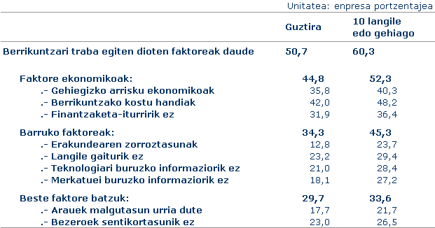 10 enplegatu edo gehiagoko establezimenduen artean % 22,0k berrikuntzari zuzendutako lankidetzak sinatu zituzten. Tamaina honetako enpresen hauei dagokienez, lankidetza-akordioren bat sinatu dutenen artean, nabarmendu beharra dago ondokoekin batera egindako lankidetza: zentro teknologikoak (% 47,6), ekipamenduen, materialen… hornitzaileak (% 46,3), adituak eta firma aholkulariak (% 35,0), enpresa bereko bestelako establezimenduak (% 34,8), unibertsitateak eta beste erakunde batzuk (27,8).
