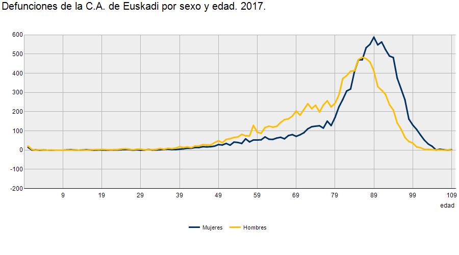 En el año 2017 tres de cada cuatro mujeres fallecidas tenían 80 años o más (77%), pero sólo el 55% de los hombres fallecidos tenía 80 años o más (poco más de la mitad); en dichas cifras se incluyen 57 mujeres centenarias y 13 hombres centenarios, según la Estadística de Defunciones.