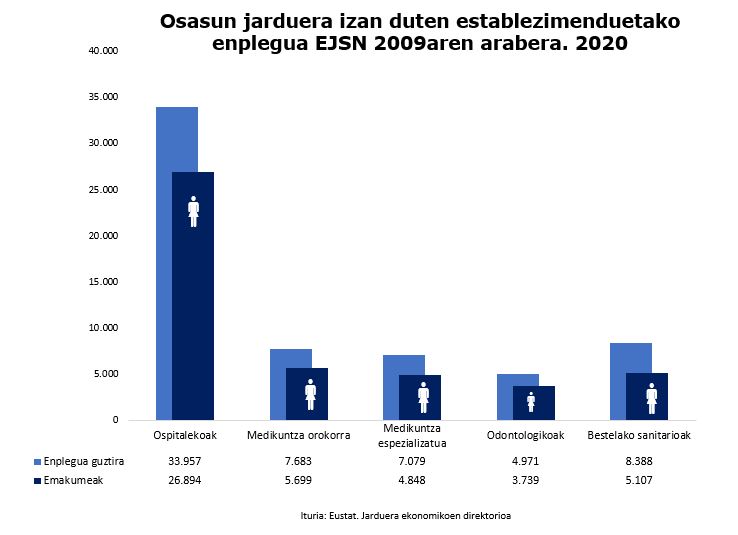 Sexuaren arabera, osasun-arloan enplegatutako pertsonen % 75 emakumeak dira; beraz, sektore feminizatuenetako bat da, Gizarte Zerbitzuak eta Hezkuntza bezalako sektoreekin batera. Ospitale-jarduerek dute feminizazio-tasarik handiena (%79).