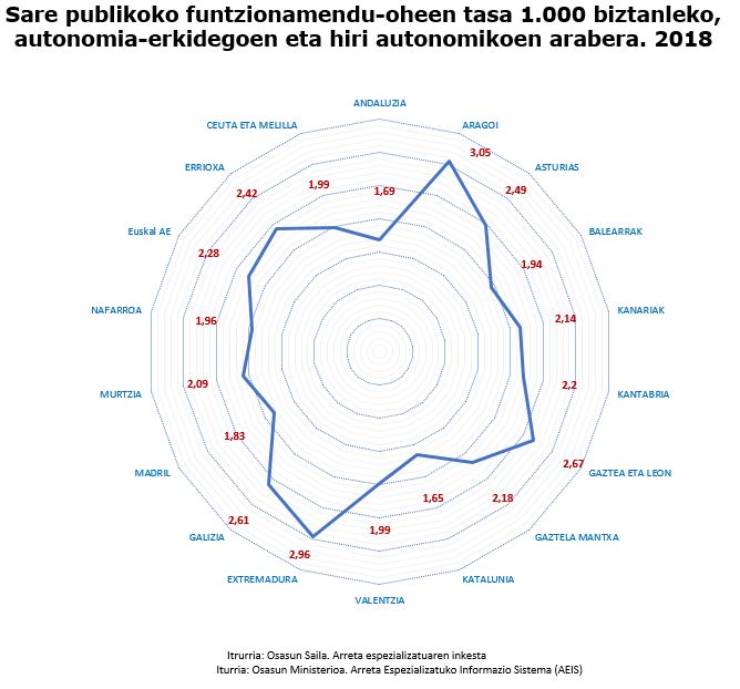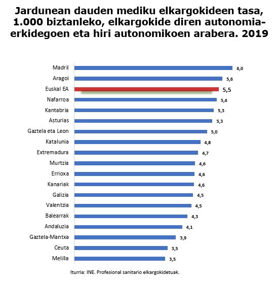 Lanean ari diren mediku elkargokideen tasarik handienak dituzten erkidegoen artean dago EAE (5,5 1.000 biztanleko), Madrilgo eta Aragoiko erkidegoen atzetik, baita erizainen kasuan ere (7,7 1.000 biztanleko), Nafarroako Foru Erkidegoaren atzetik.