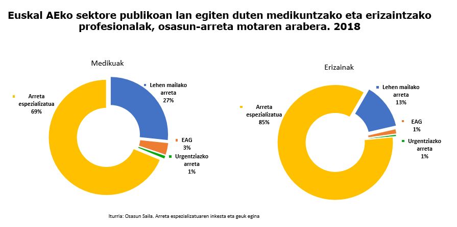 Asistentzia-mailen arabera, lehen mailako arretan (osasun-zentroak eta kontsultategiak) langile gehiago zeuden medikuntzan (1.809) erizaintzan baino (1.558), baita ospitalez kanpoko larrialdietako arretan ere (Etengabeko Arreta Guneak eta Larrialdietako eta Emergentzietako Zerbitzuak), 311 mediku eta 249 erizainekin; alabaina, arreta espezializatuan (ospitaleak eta mendeko zentroak) erizain gehiago enplegatu ziren (10.6128) medikuntzan baino (4.6128). Horrek esan nahi du erizaintza/medikuntzako langileen ratioa 2,2koa izan zela.