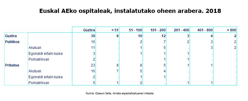 Arreta sanitarioko euskal sektore publikoan pribatuan baino ospitale gutxiago dago, baina handiagoak dira: 7 ospitale publikok 200 ohe baino gehiago dituzte (3k 400 ohe baino gehiago eta 2k 800 ohe baino gehiago); ospitale pribatuen kasuan, 2 ospitale psikiatrikok baino ez dituzte 200 ohe baino gehiago.