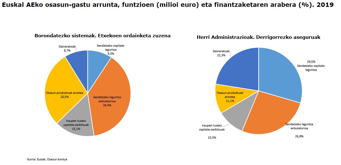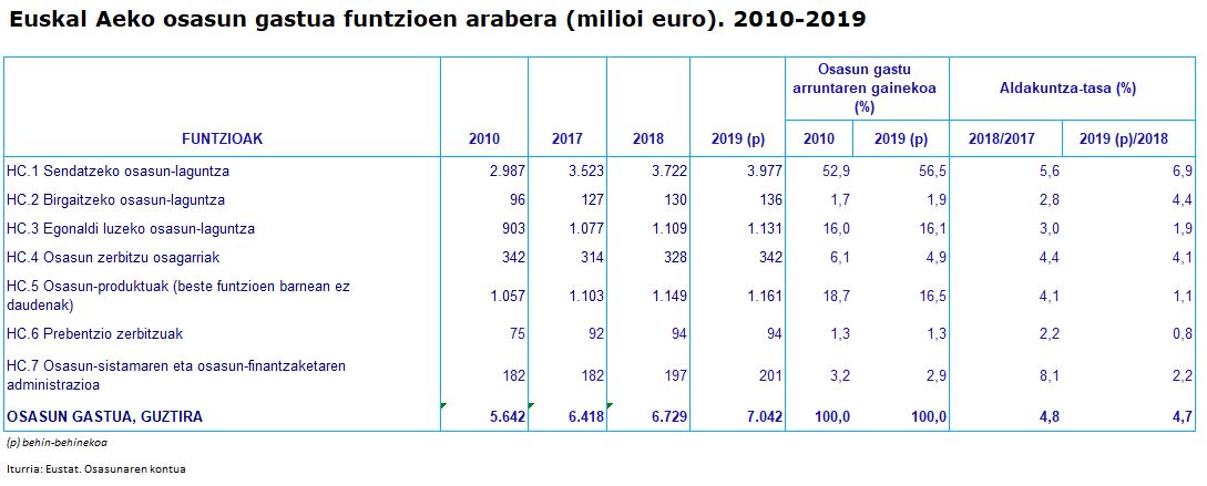 Osasunaren Kontuko datuak funtzioen arabera aztertuz gero, ikusten da Euskal Autonomia Erkidegoan osasun-asistentzia sendagarriak duela oraindik ere pisurik handiena; izan ere, 2019an gastu arruntaren % 56,5 hartu zuen, eta % 6,9 igo zen, gainera, 2018arekin alderatuta. Bigarren funtzioa, garrantziari dagokionez, produktu medikoei dagokie (produktu farmazeutikoak, protesiak...), gastu arruntaren % 16,5ekin, eta % 1,1eko igoera izan du 2018. urtearekin alderatuta. Hirugarrenik, egonaldi luzeko osasun-laguntzako gastua (mendetasuna duten pertsonei osasun-arreta emateko gastua barne): gastu arruntaren % 16,1 izan zen, eta % 1,9 igo zen 2018. urtearekin alderatuta.