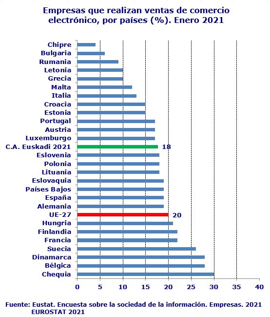 Teniendo todo ello en cuenta, se observa como en la C. A. de Euskadi, a pesar de los incrementos producidos en los últimos años, la incidencia que este tipo de intercambios tiene en las empresas vascas es baja, situándose en los lugares bajos del gráfico y siendo superada por gran parte de los países de la Unión Europea, tanto en la proporción de empresas que realizan compras como en las que realizan ventas electrónicas.