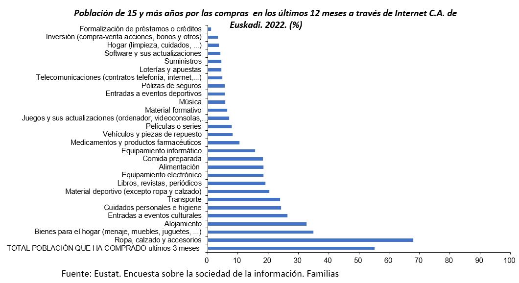 Más de la mitad de personas usuarias de Internet ha adquirido en 2022 algún bien o servicio a través de este medio en los últimos 3 meses. Este colectivo, se decanta principalmente por compra de ropa y calzado (dos tercios del colectivo), bienes para el hogar, alojamientos, entradas a espectáculos, cuidados personales y de higiene, transporte y material deportivo.