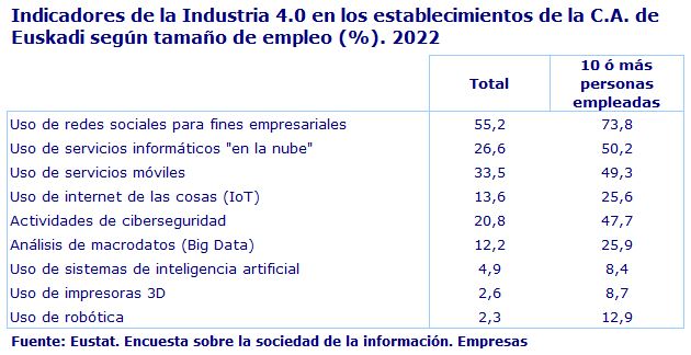 En el caso de los establecimientos de 10 o más personas empleadas estos porcentajes son superiores: Redes Sociales alcanza al 73,8% de los establecimientos de este tamaño y, entorno al 50%, se encuentran Servicios Móviles, Servicios Informáticos en la Nube y las Actividades de Ciber-Seguridad. Análisis Big Data e Internet de las Cosas (IoT) superan el 25%. También se puede destacar el uso de Robótica pues, aunque se da en el 12,9% de los casos en este tamaño y a nivel global, si se tiene en cuenta el sector de actividad, en Industria alcanza el 22%.