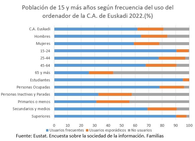 La relación con el ordenador permite diferenciar entre personas usuarias frecuentes (quienes declaran usar el ordenador diariamente o al menos una vez por semana), usuarias esporádicas (usan el ordenador al menos una vez al mes, no todos los meses y alguna vez, aunque no en los últimos 3 meses) y no usuarias (quienes declaran no haber usado nunca un ordenador).