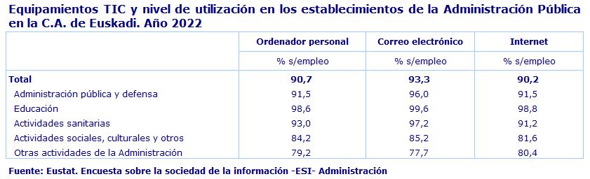 La proporción de personas empleadas en la administración que utiliza equipamientos TIC se sitúa en unos niveles muy elevados, rondando el 90%. En el sector empresa estos porcentajes de utilización por parte del personal son inferiores, en torno al 70%.