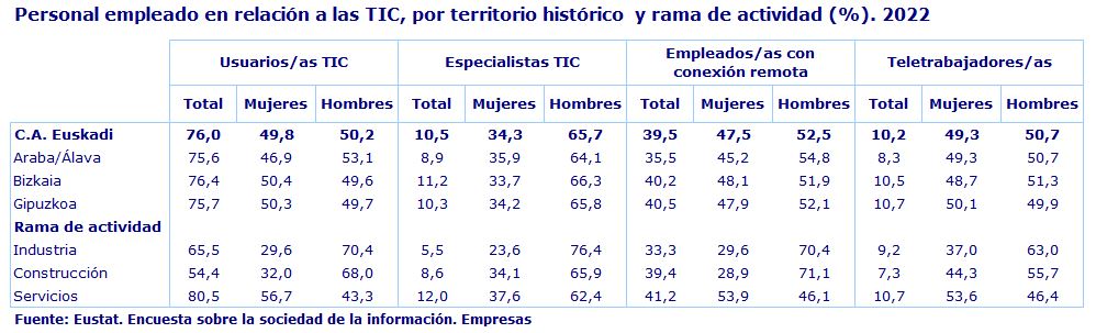 Además, de media, tres cuartas partes del personal es usuario de sistemas TIC (Tecnologías de la información y de la comunicación), y se constata que en torno al 10% es personal especialista en sistemas TIC. Asimismo, algo más de un tercio del total del personal dispone de conexión remota mediante un dispositivo portátil para uso profesional y el 10,2% realiza teletrabajo en 2022, descendiendo respecto al año anterior pero conservando niveles muy superiores a los de antes de la pandemia.